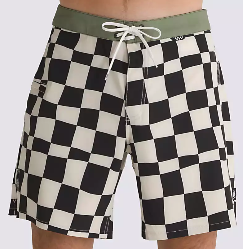 This boardshort also features a fixed waistband with a drawcord, a zippered pocket on the right thigh, and a Vans branded woven label