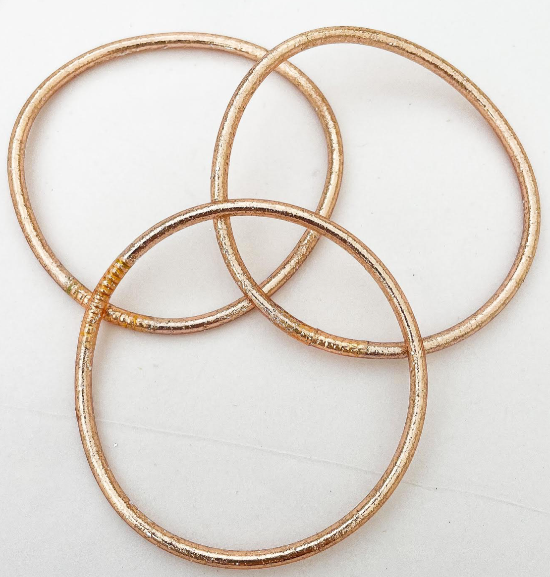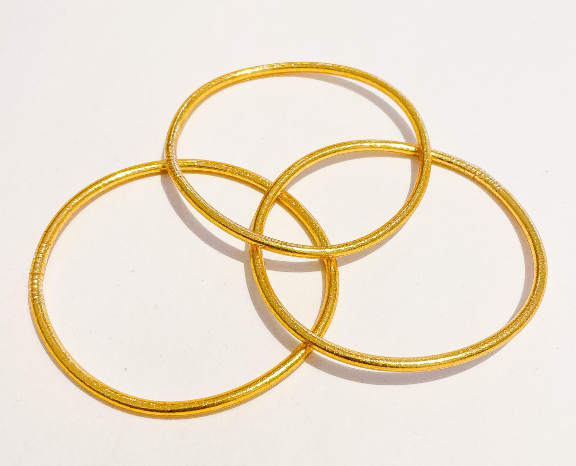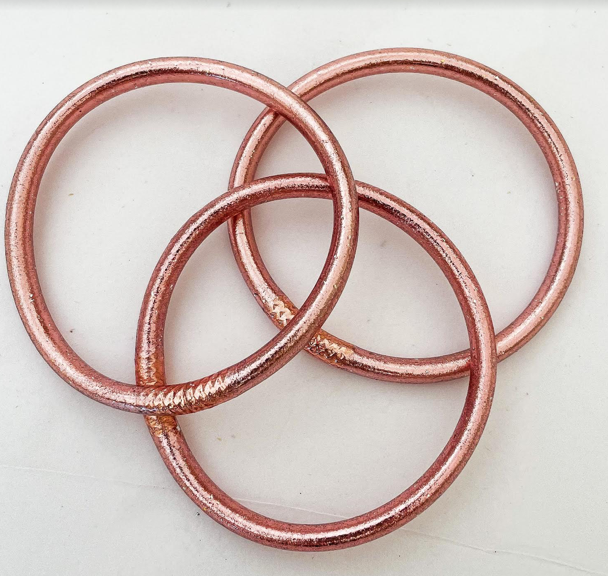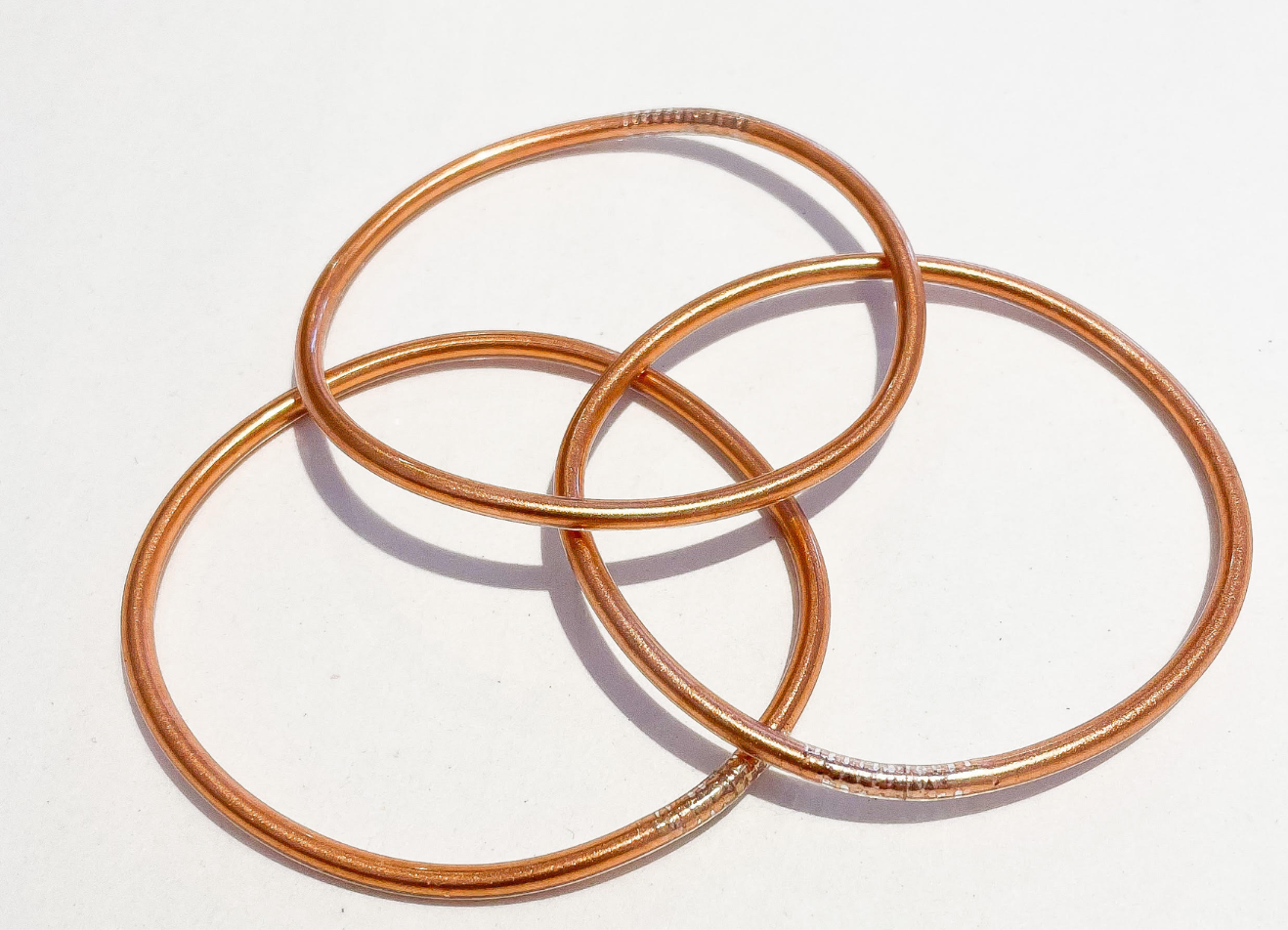 From the temples of Thailand these bracelets are made of clear plastic tubes w/ pure 24k gold leaf lining, sterling silver, and copper
