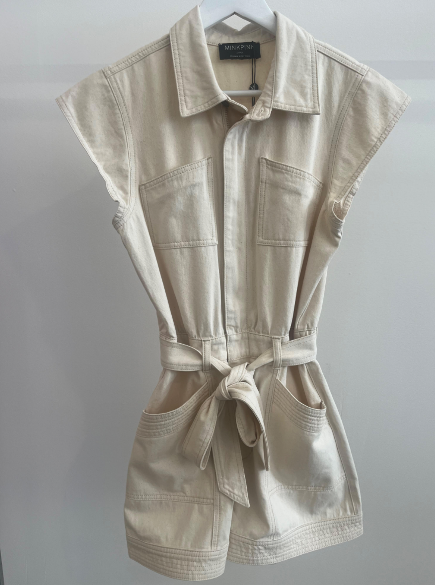 The Codi Panel sleeveless playsuit features a cream-colored denim fabrication with a collared neckline
