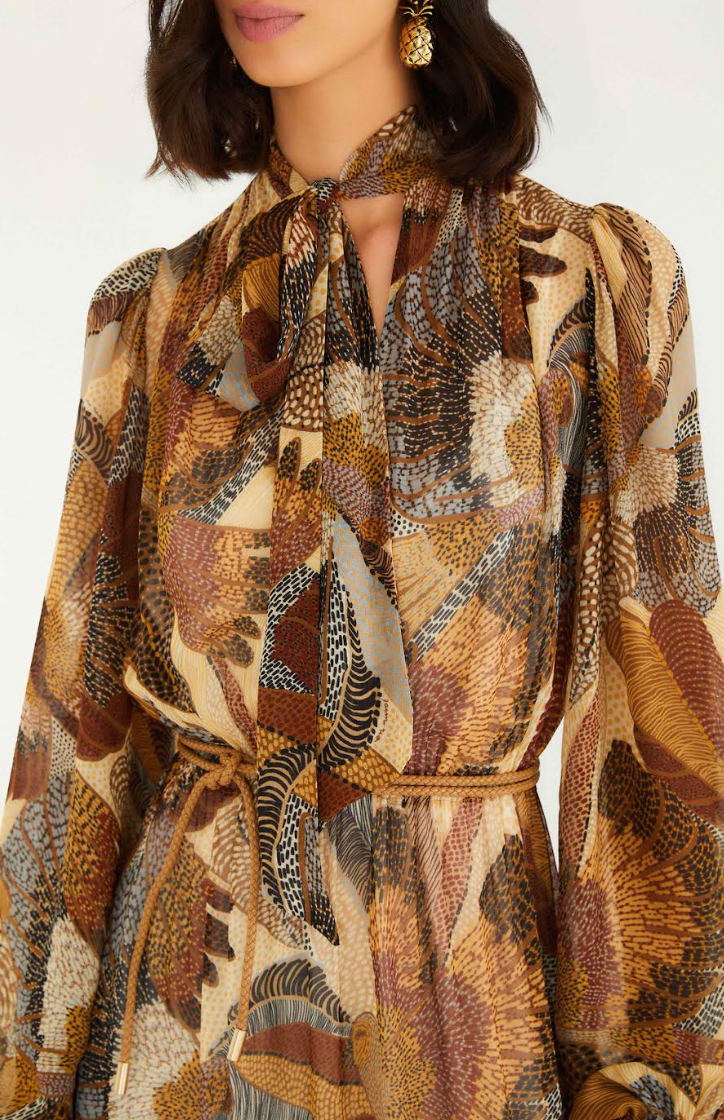 This elegant maxi-length dress features a delicate dotted macaw all-over print with a neck tie detail that enhances its graceful charm