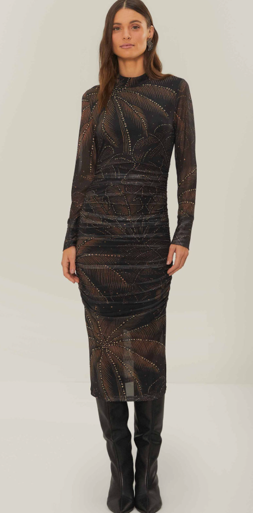Its sheer black tulle canvas is adorned with a golden foliage pattern that dances gracefully across the fabric