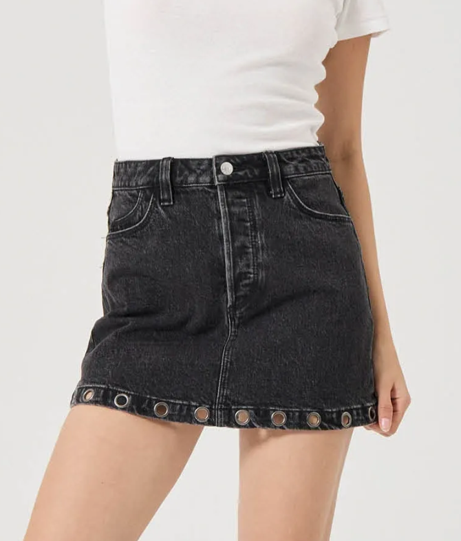 Add some edge to your closet with this denim mini skirt with grommet details!