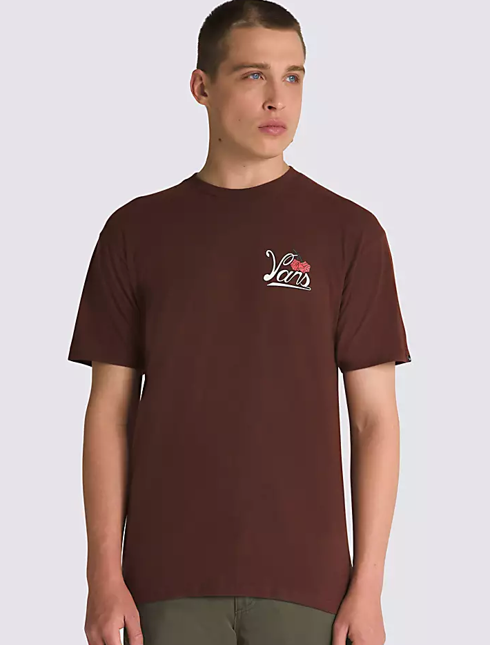 The Hot Box Cars T-Shirt is a short sleeve crewneck tee made from a heavier weight cotton and features a printed Vans logo on the front and a graphic of some hot dice action on the back