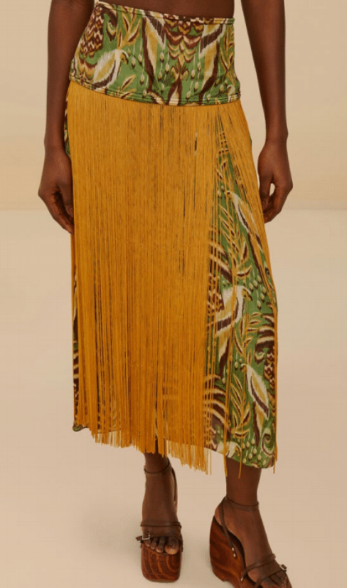 The Pineapple Tapestry Fringe Skirt features elegant tropical patterns in beautiful hues