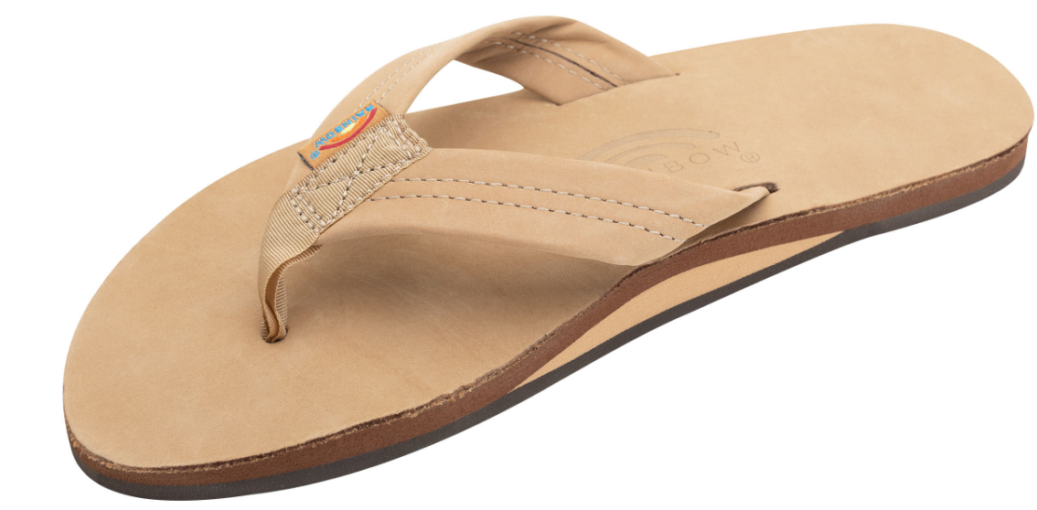 The single layer premier leather sandal is made of top grade nubuck leather; the top sole is embossed with the Rainbow® logo