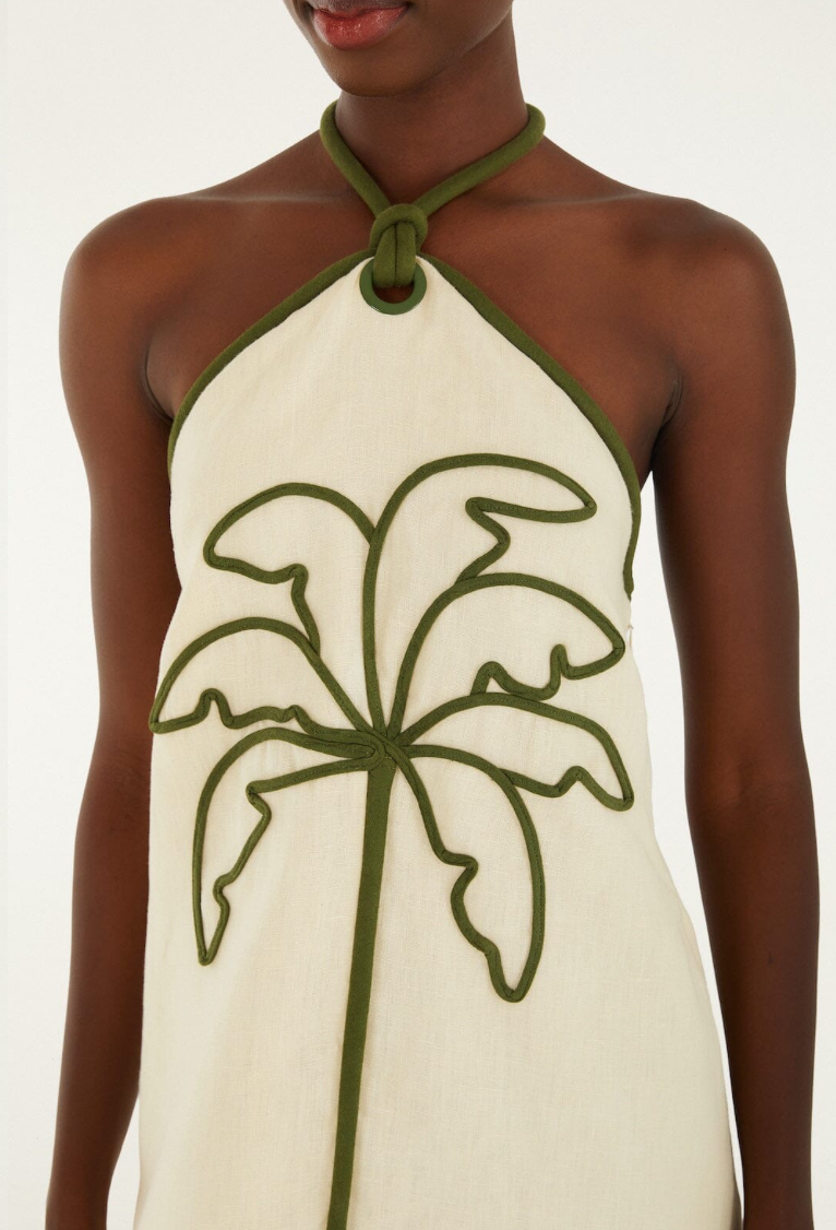 Embrace effortless tropical charm with the Sand Coconut Embroidery Halter Neck Mini Dress from FARM Rio