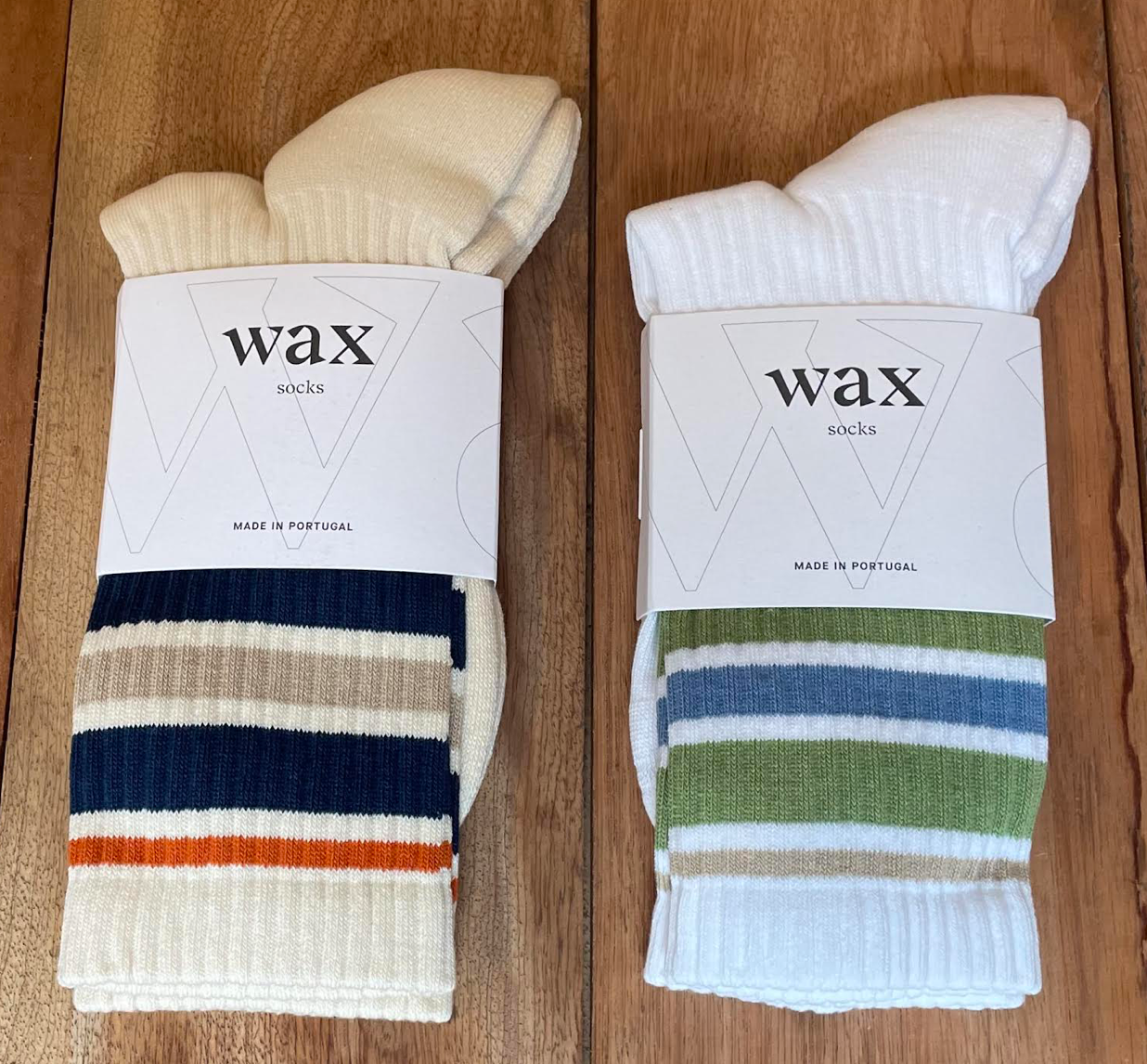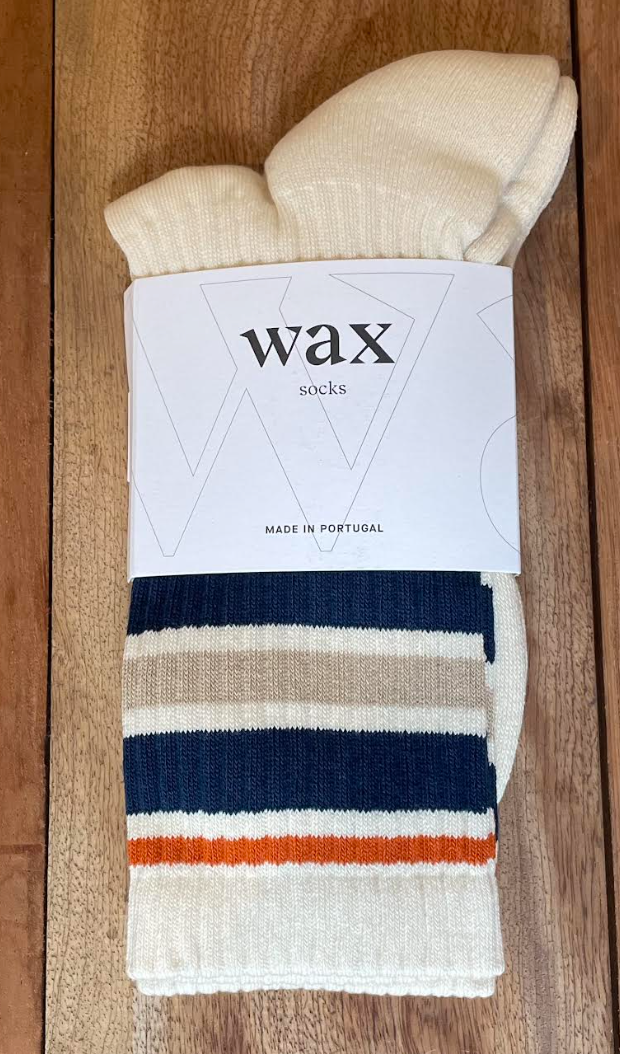 Inspired by retro sport socks with a Wax branded twist, the Striped Socks in white/sage and ecru/navy are made from 100% ribbed cotton and features extra cushioning on the sole and ribbing around the foot for enhanced comfort