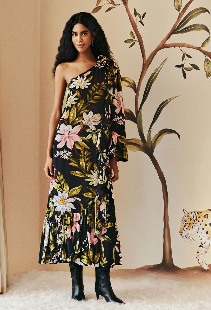 With an exquisite all over floral design, this elegant maxi dress flows with grace and features a sleek one shoulder design