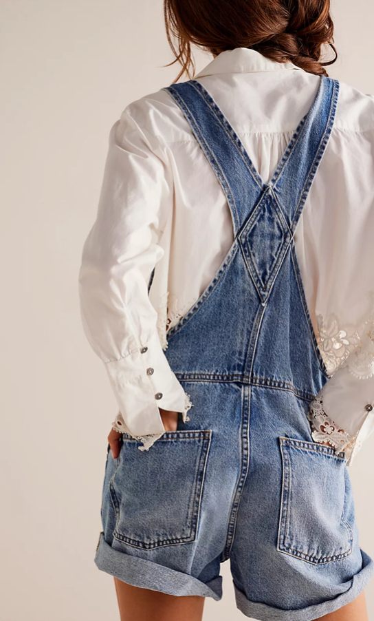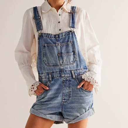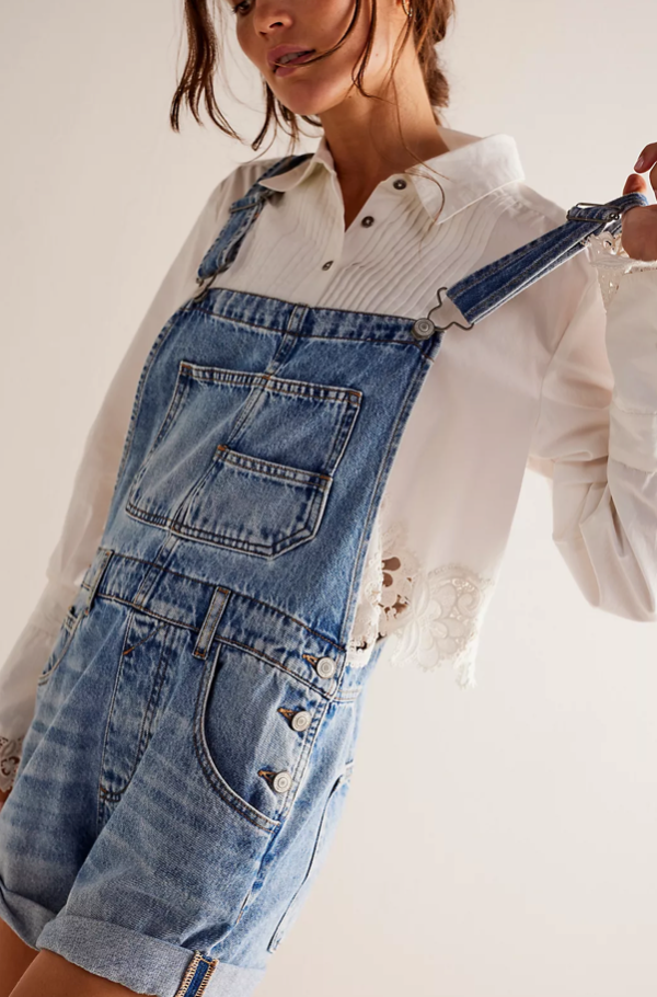 Featuring front bib pocket, rolled hemlines, adjustable straps, side button closures, five-pocket design, frayed cuffs